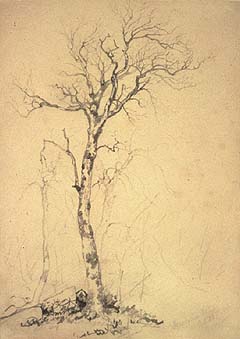 J ohn Frederick Kensett (1816-1872) was one of the leading figures of the Hudson River School, the renowned group of artists who celebrated the nineteenth-century American landscape. Kensett compiled hundreds of pencil sketches while touring the North American continent during the warmer months of the year. These drawings then served as source material for the paintings he created during the winter in his studio. A selection of Kensett's costumed figure studies, rendered in pencil and watercolor, will complement the exhibit's display of the artist's better-known American landscape sketches. Kensett produced numerous figurative drawings during his years spent overseas, as consideration of the human form was an intrinsic element of the revered European artistic tradition. (left: Tree Study, Franconia Notch, 1850, pencil on buff paper, 13 1/2 x 9 7/8 inches, by John E Kensett (American, 1816-1872). Gift of Michael St. Clair. Collection of the Palmer Museum of Art.)